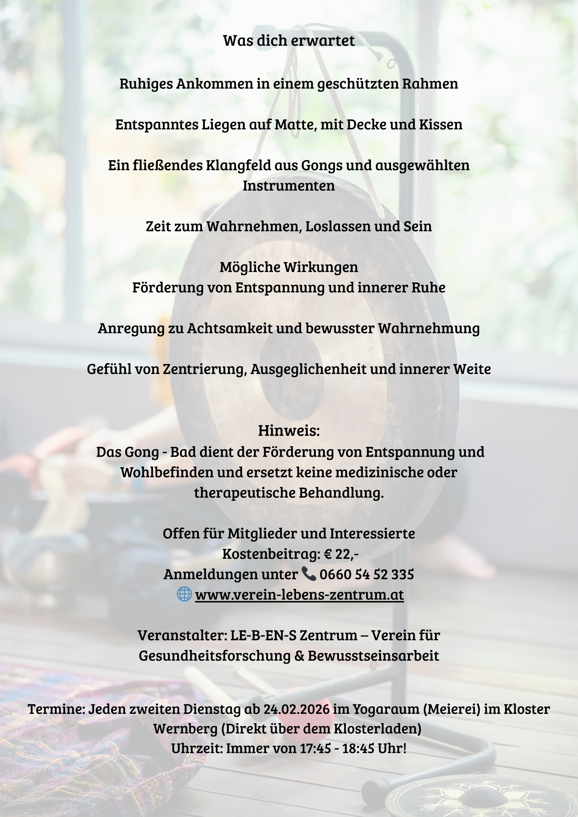 Die Gong-Abende sind eine Einladung zur inneren Einkehr, zur bewussten Wahrnehmung und zur sanften Verbindung mit dir selbst.