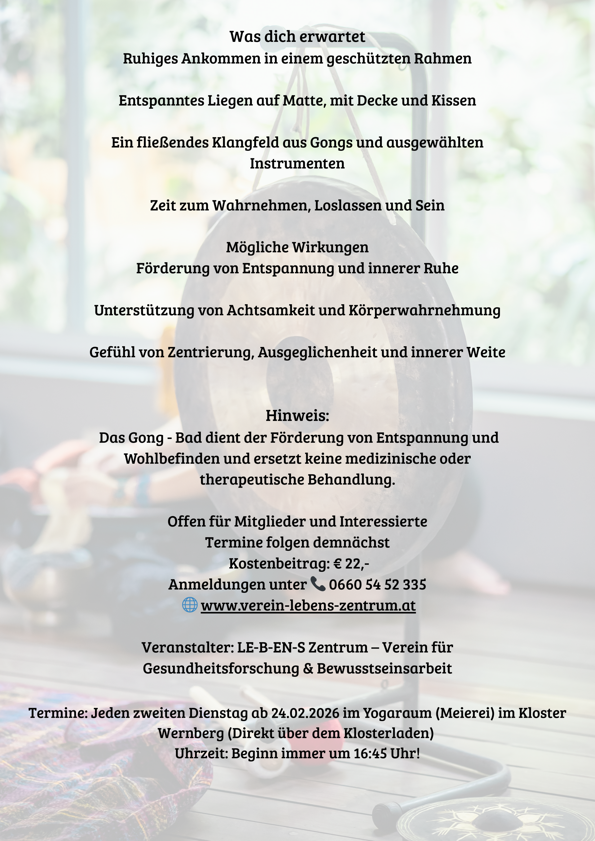 Erlebe bei unseren Gong-Abenden im Kloster Wernberg eine Oase der Entspannung. Lass dich von den harmonischen Klängen und vibrierenden Schwingungen mitreißen, die dir pure Freude und unvergessliche Momente schenken. Diese Abende sind ideal, um dem Alltag zu entfliehen, neue Energie zu schöpfen und offen für außergewöhnliche Erfahrungen zu sein.